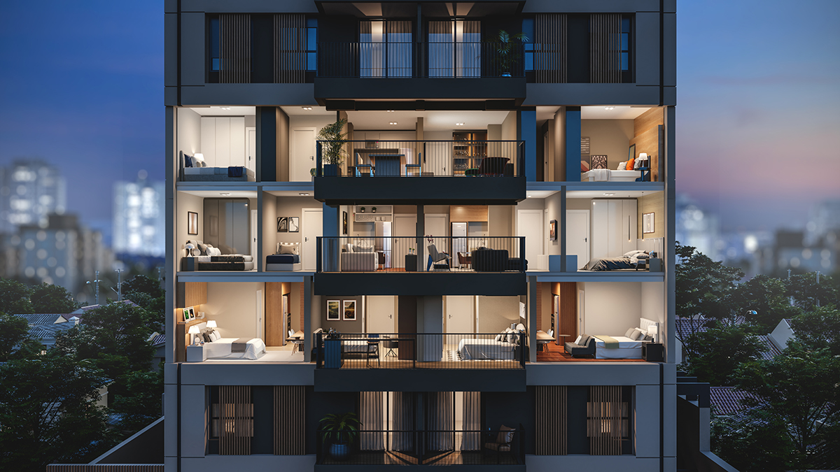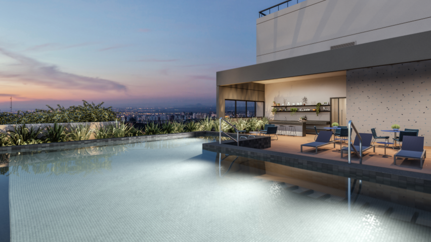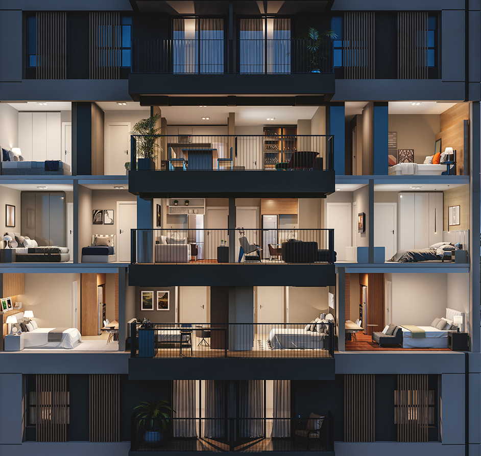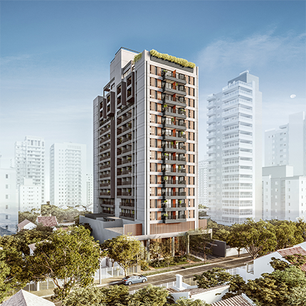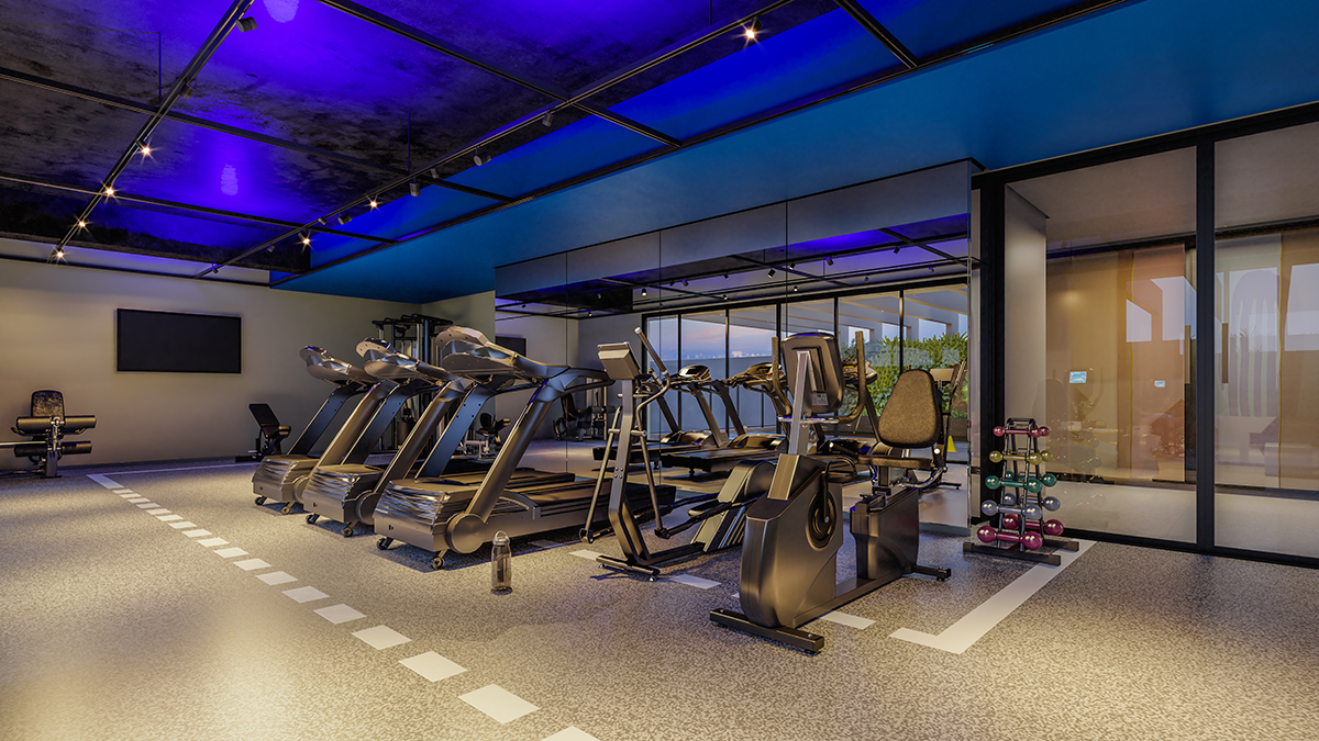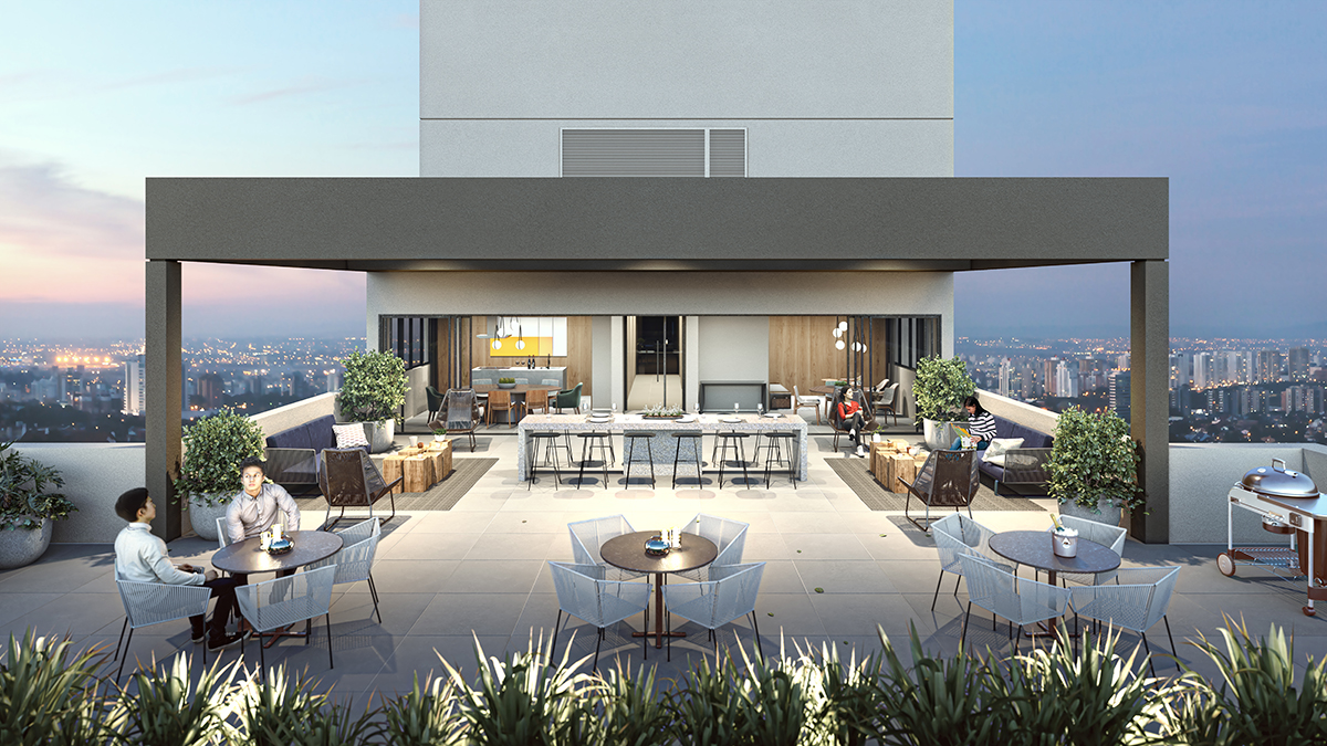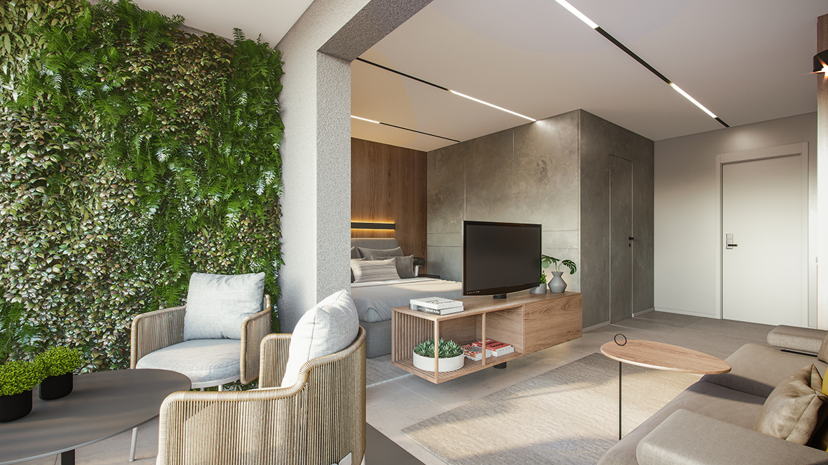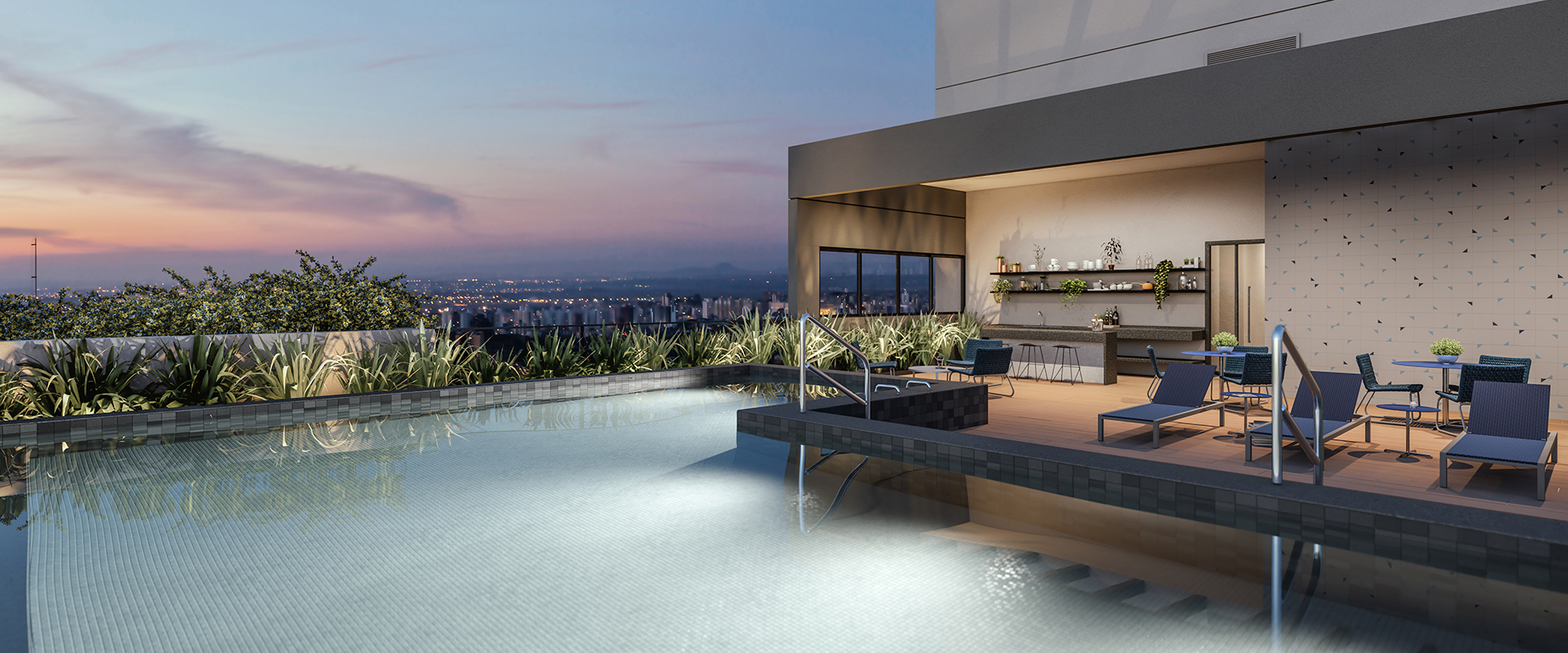 Diferenciais das unidades: Studios prontos para uso: unidades entregues com porcelanato, forro de gesso, luminárias, infraestrutura completa para ar condicionado, chuveiro, box de vidro e espelho no banho | Terraço com ralo linear | Fechaduras digitais com controle de acesso por biometria nas unidades | Medidor individual de água entregue para as unidades | Unidades com atenuação acústica | Sistema completo de aquecimento das unidades