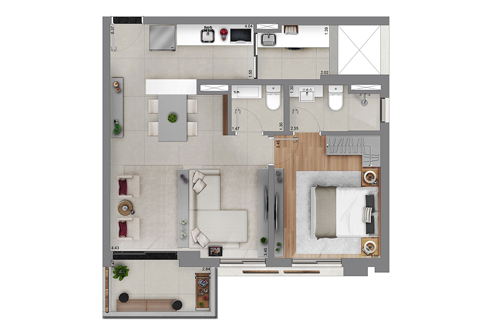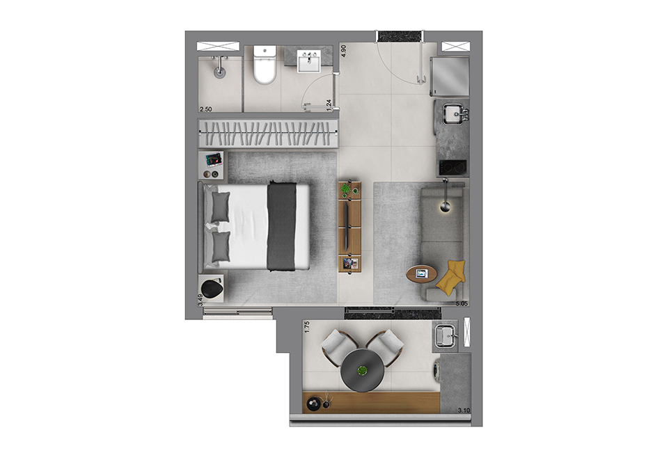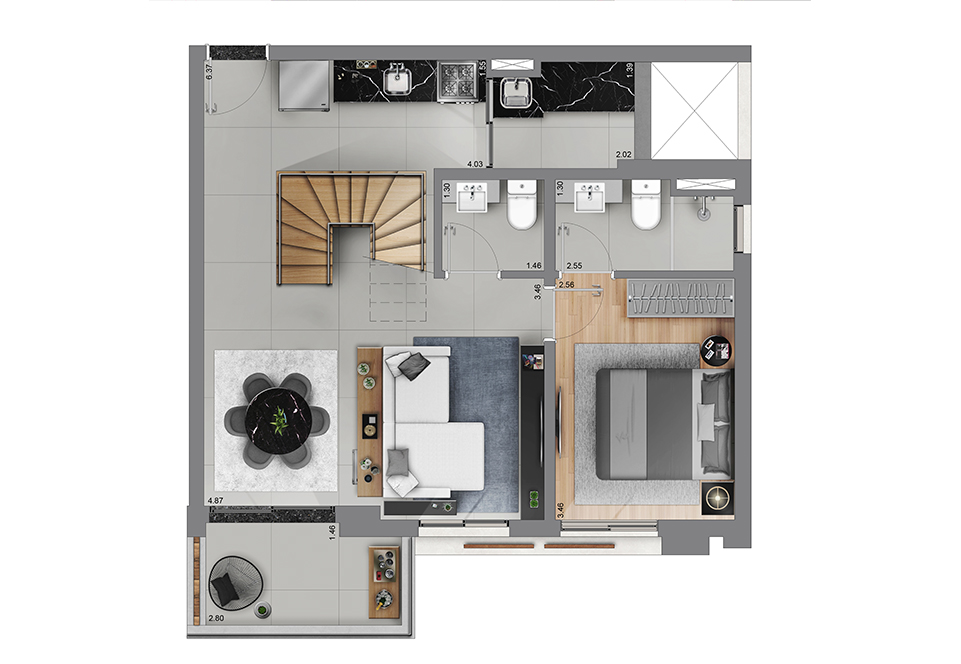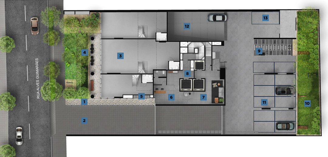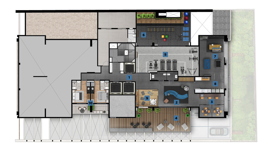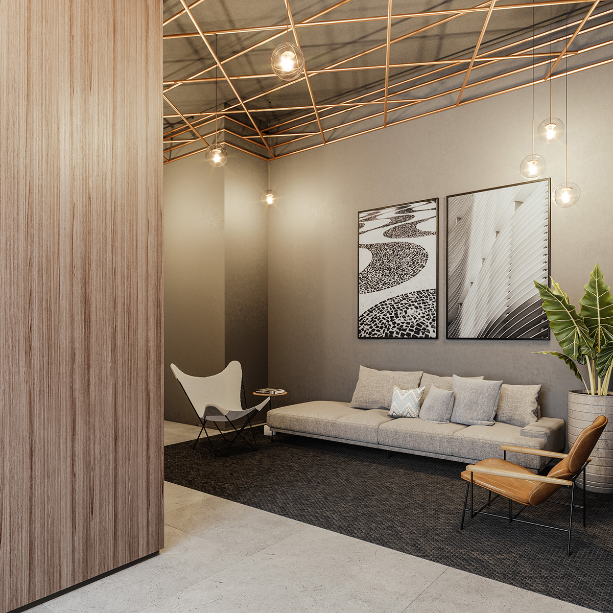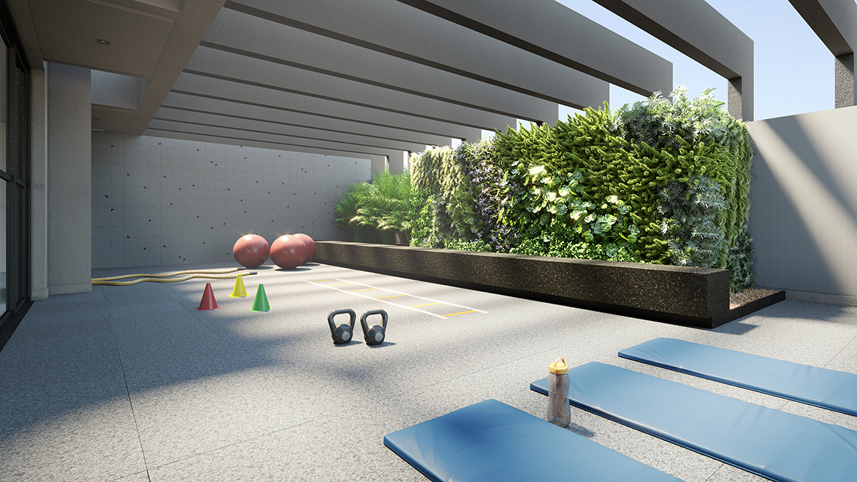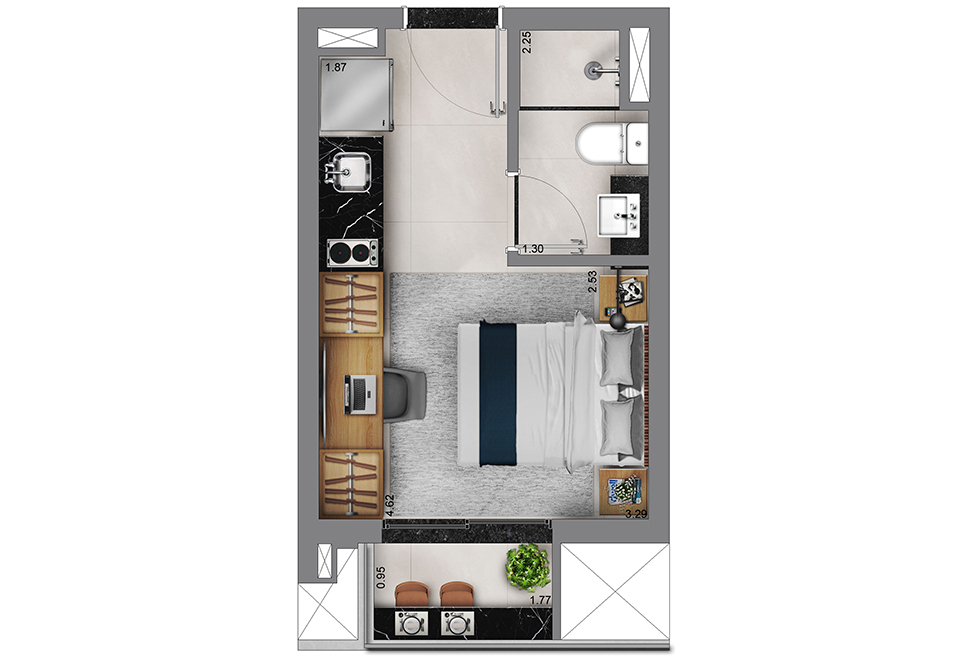 Diferenciais das unidades: Studios prontos para uso: unidades entregues com porcelanato, forro de gesso, luminárias, infraestrutura completa para ar condicionado, chuveiro, box de vidro e espelho no banho | Terraço com ralo linear | Fechaduras digitais com controle de acesso por biometria nas unidades | Medidor individual de água entregue para as unidades | Unidades com atenuação acústica | Sistema completo de aquecimento das unidades