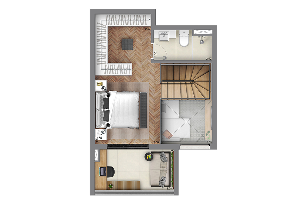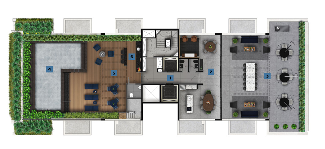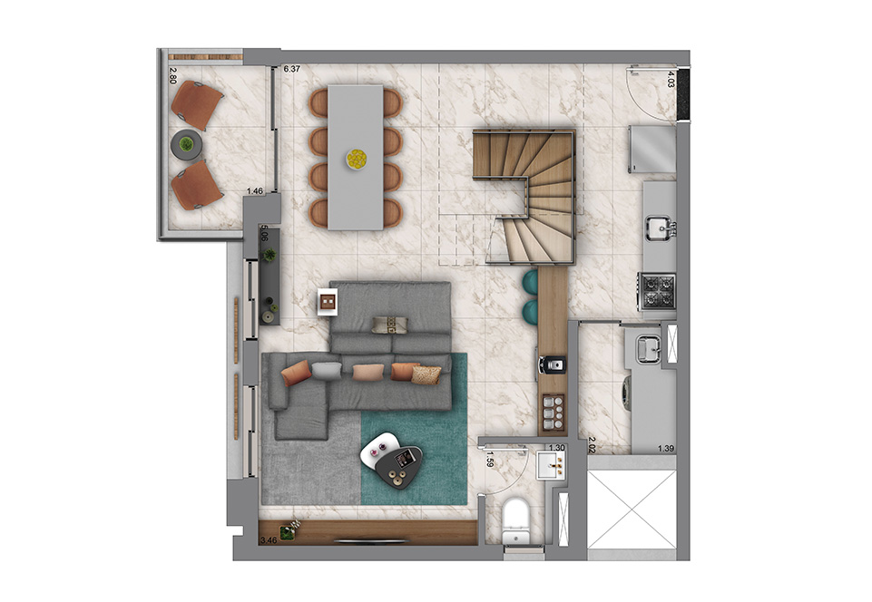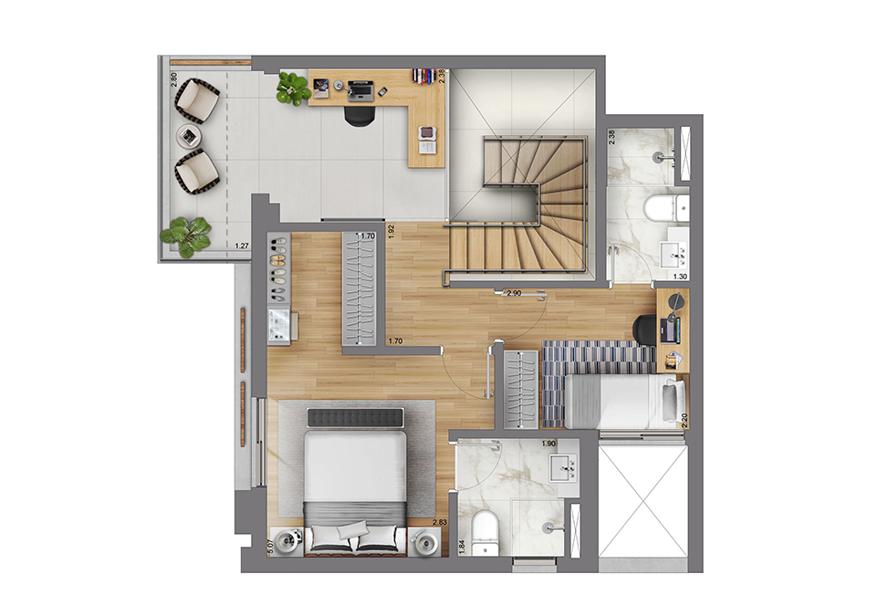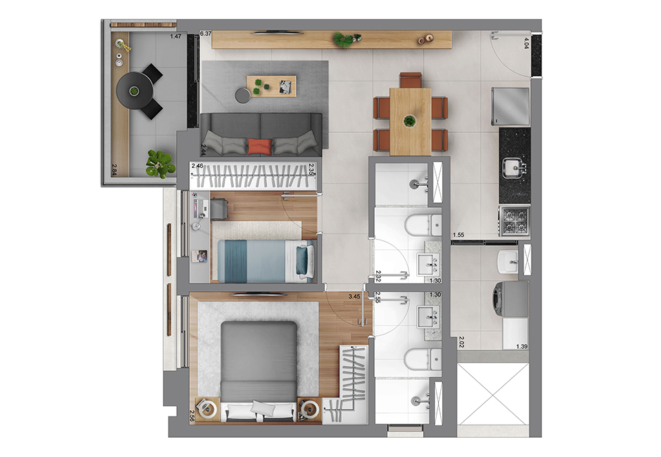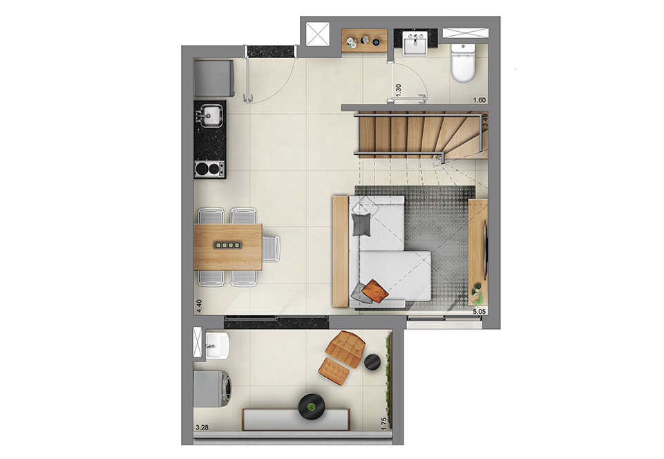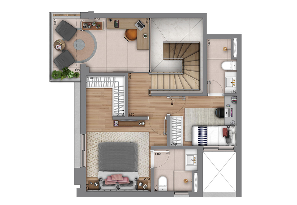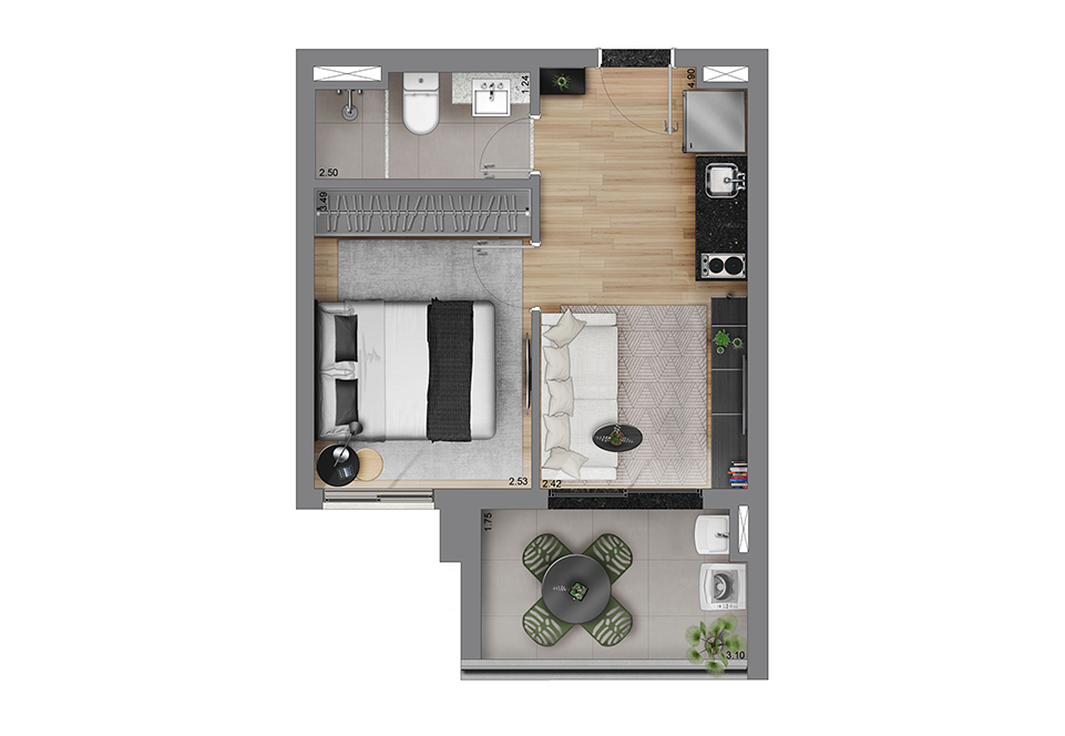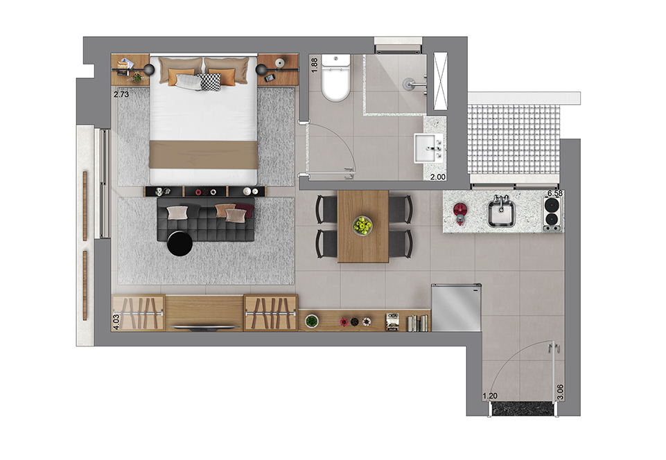 Diferenciais das unidades: Studios prontos para uso: unidades entregues com porcelanato, forro de gesso, luminárias, infraestrutura completa para ar condicionado, chuveiro, box de vidro e espelho no banho | Terraço com ralo linear | Fechaduras digitais com controle de acesso por biometria nas unidades | Medidor individual de água entregue para as unidades | Unidades com atenuação acústica | Sistema completo de aquecimento das unidades
